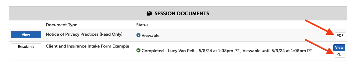 Example waiting room page, with "Session Documents" section listing 2 required and 1 option document, and an arrow pointing at the first Submit button.