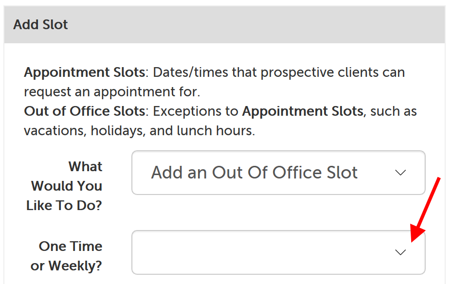 This support article will go over the process for adding out of office slots to your calendar, which are exceptions to any appointment slots you have already added (or may add) in the future. (If you use the Google Calendar or Microsoft Outlook calendar integrations, our system will already reference your other calendar for times that you have something else scheduled, so that it is not shown to potential participants. You will not need to add an out of office slot if that time is already blocked off in your connected Google or Outlook calendar.)