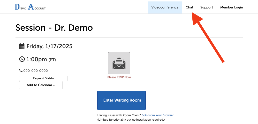 1. If you would like to create a chat group with the same participants as a current or upcoming video meeting, click on the "Start Chat" button on that session panel.