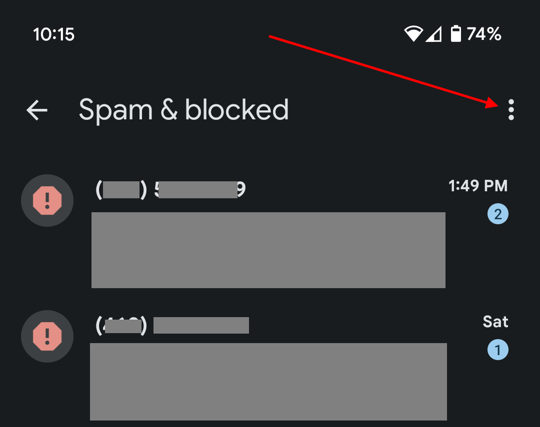 4. Scroll through recently blocked messages to see if you can find one from a SecureVideo number, or tap on the 3 dots in the upper right hand corner.